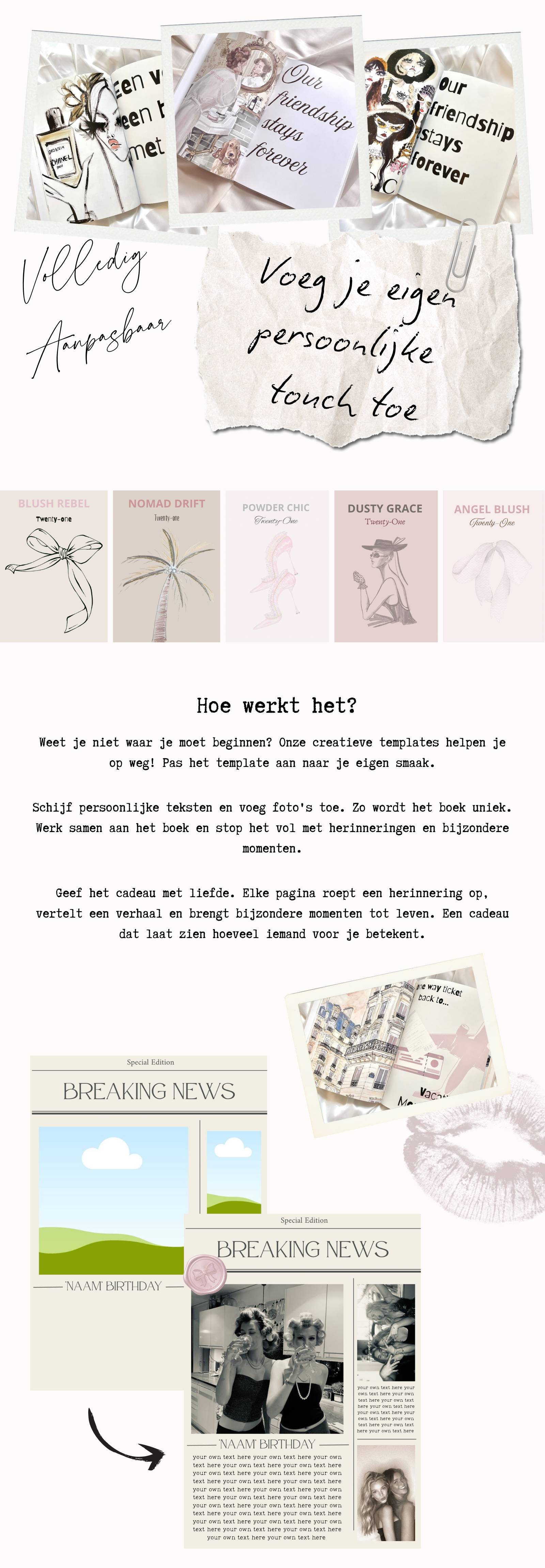 Je kunt alles aanpassen! Zo kun je het hele template naar jouw eigen smaak maken, zo wordt het boek wat je geeft zo persoonlijk mogelijk. Hier zijn wat voorbeelden van dingen die je zelf kunt aanpassen: