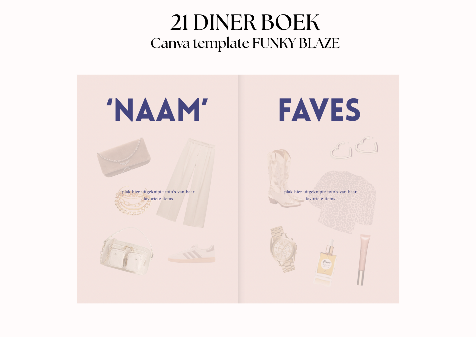Template 'Funky Blaze' is een 21 diner boek die je volledig kunt aanpassen in Canva. Voeg je eigen persoonlijke teksten en foto's toe aan het template en geef je vriendin een prachtig boek vol herinneringen cadeau!