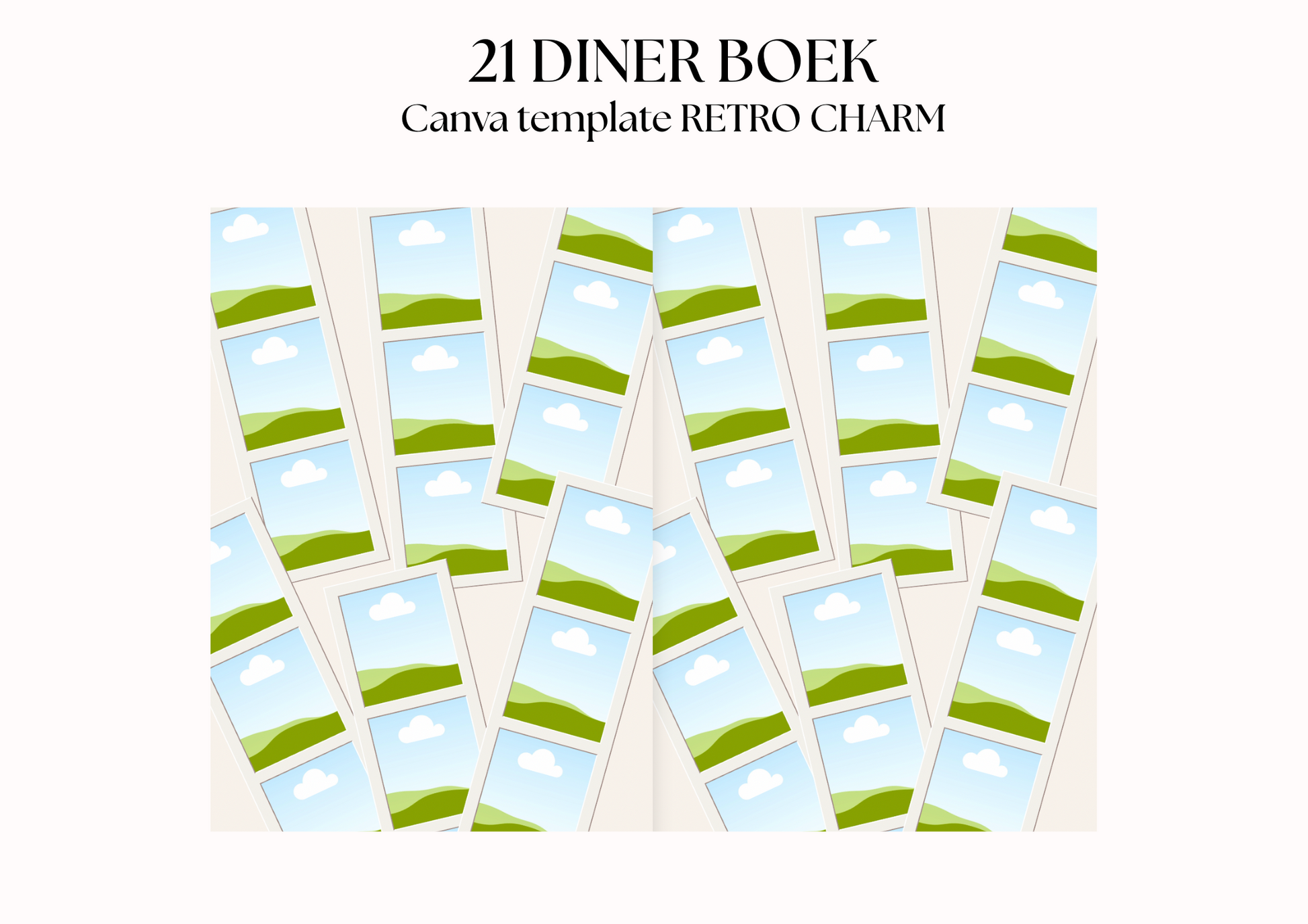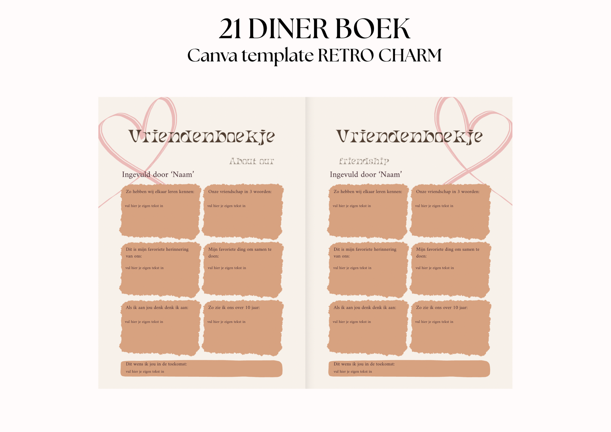 Template 'Retro Charm' is een 21 diner boek die je volledig kunt aanpassen in Canva. Voeg je eigen persoonlijke teksten en foto's toe aan het template en geef je vriendin een prachtig boek vol herinneringen cadeau!