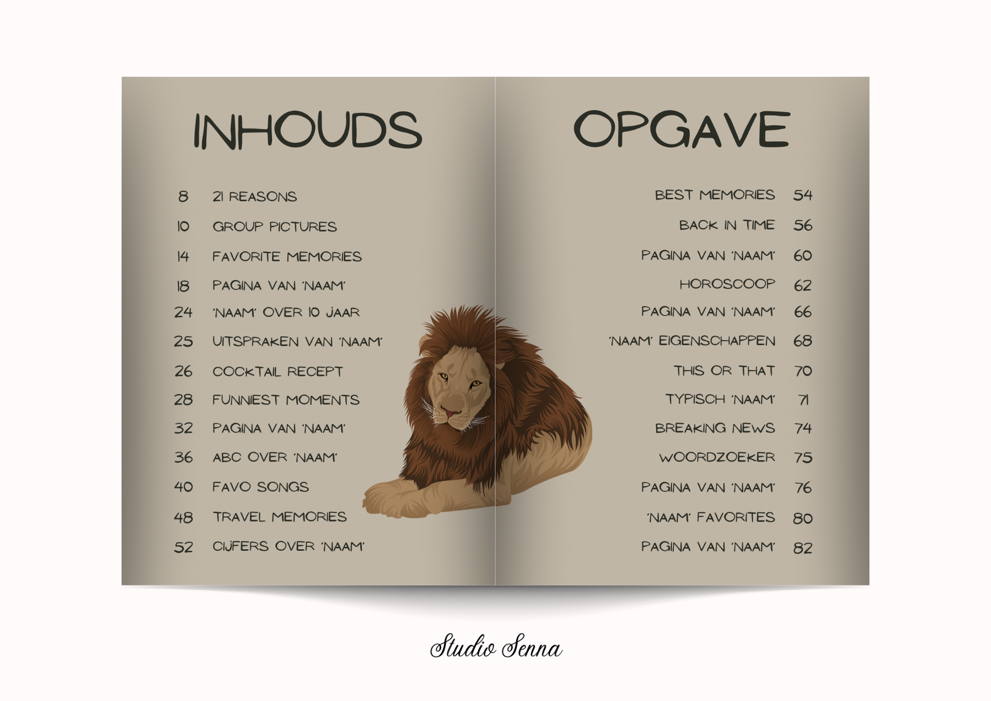 Template 'Safari Flame' is een 21 diner boek die je volledig kunt aanpassen in Canva. Voeg je eigen persoonlijke teksten en foto's toe aan het template en geef je vriendin een prachtig boek vol herinneringen cadeau!
