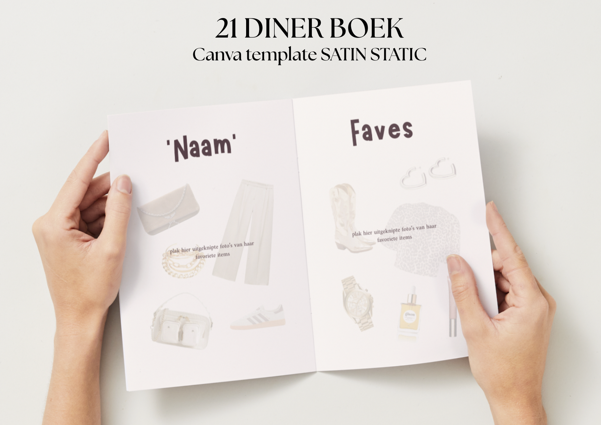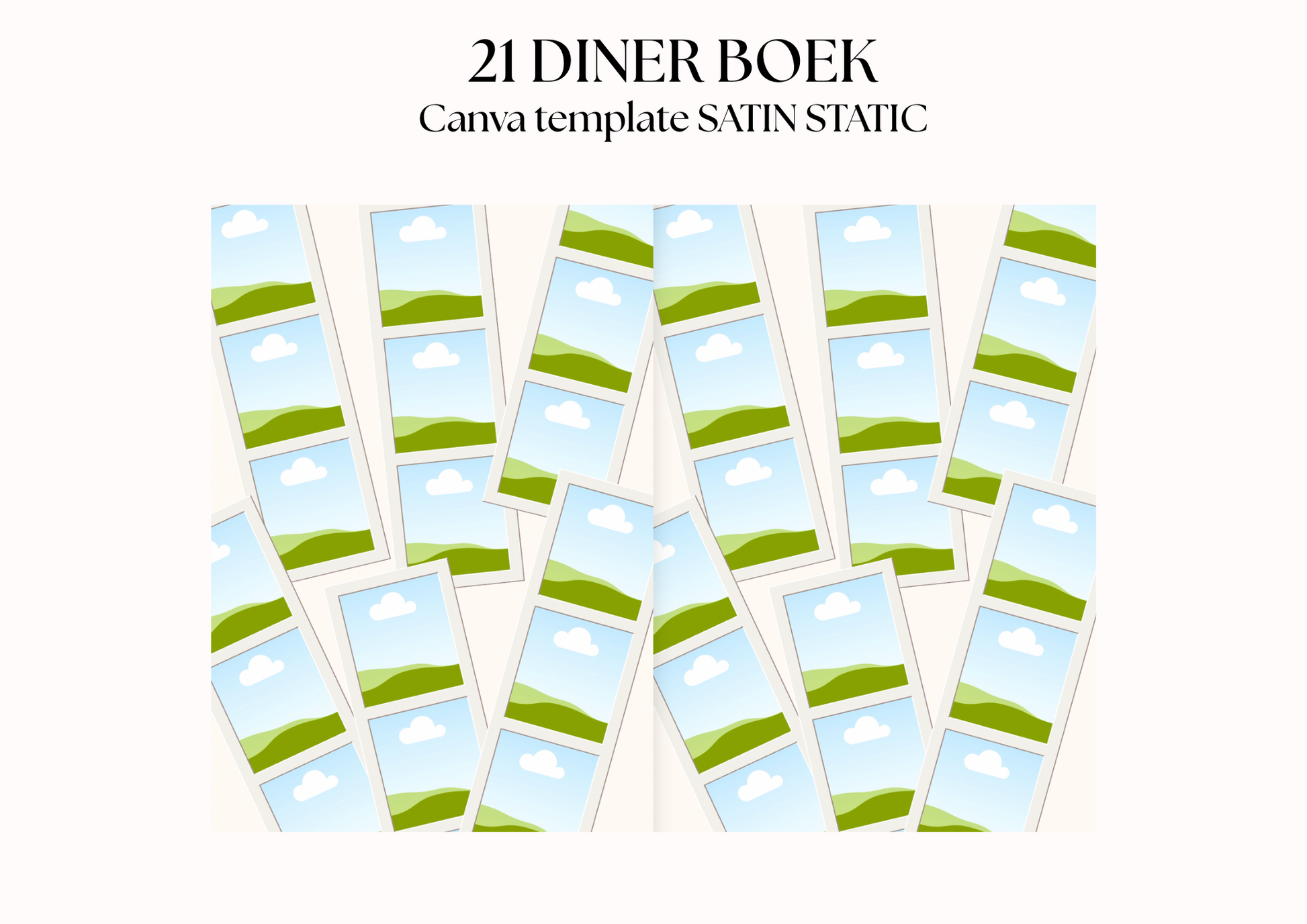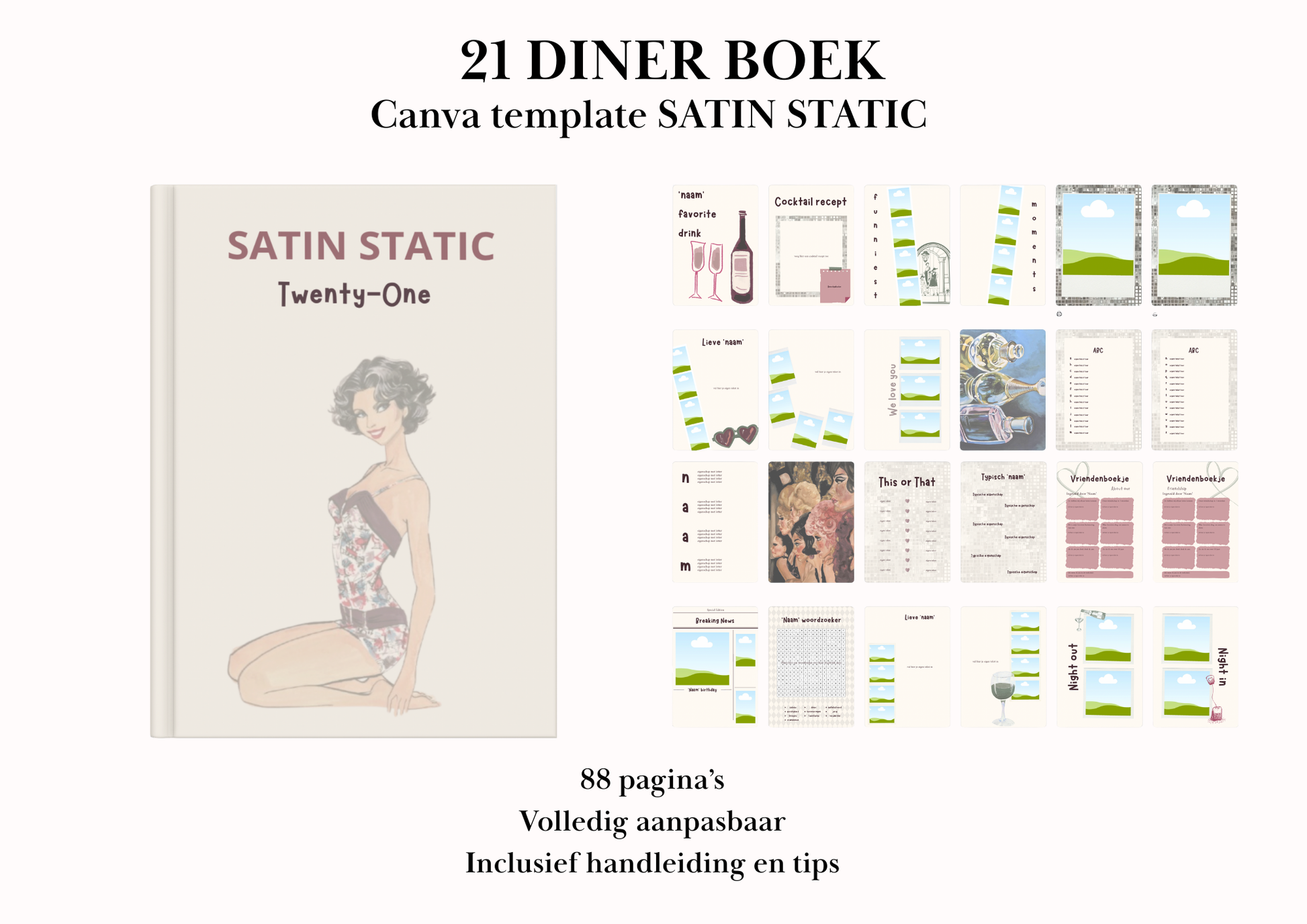 Template 'Satin Static' is een 21 diner boek die je volledig kunt aanpassen in Canva. Voeg je eigen persoonlijke teksten en foto's toe aan het template en geef je vriendin een prachtig boek vol herinneringen cadeau!