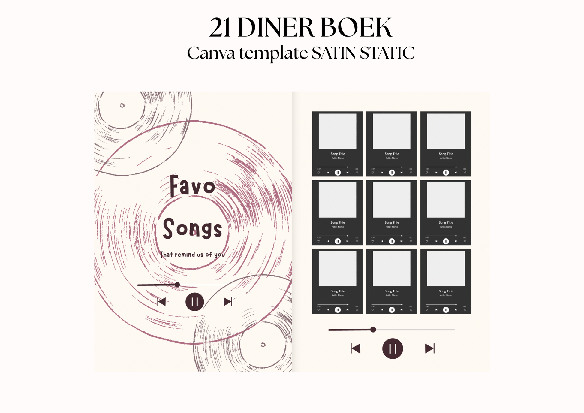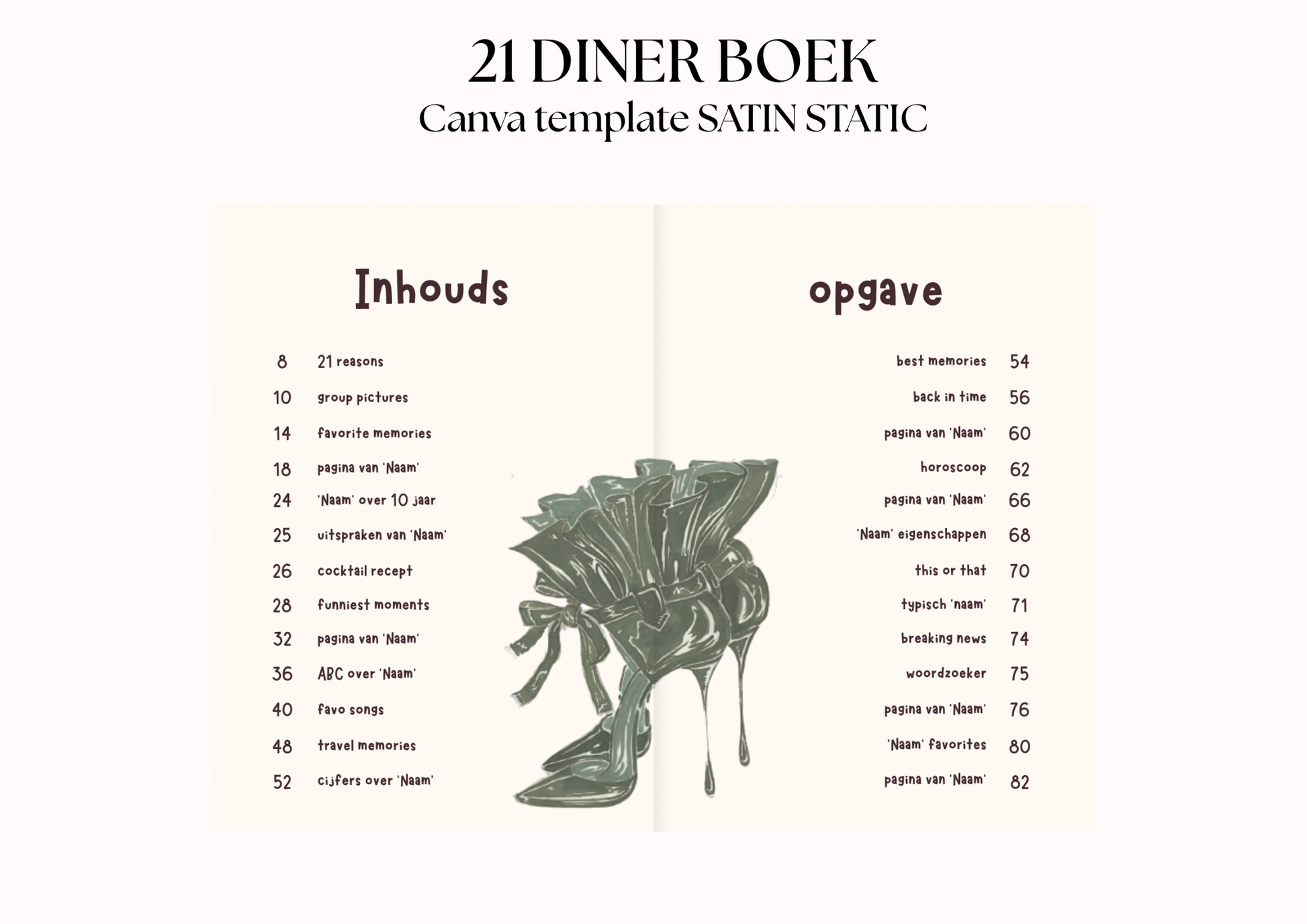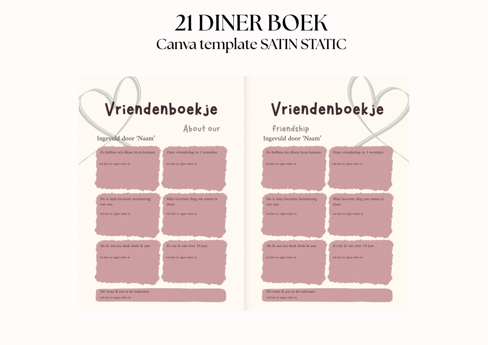 Template 'Satin Static' is een 21 diner boek die je volledig kunt aanpassen in Canva. Voeg je eigen persoonlijke teksten en foto's toe aan het template en geef je vriendin een prachtig boek vol herinneringen cadeau!