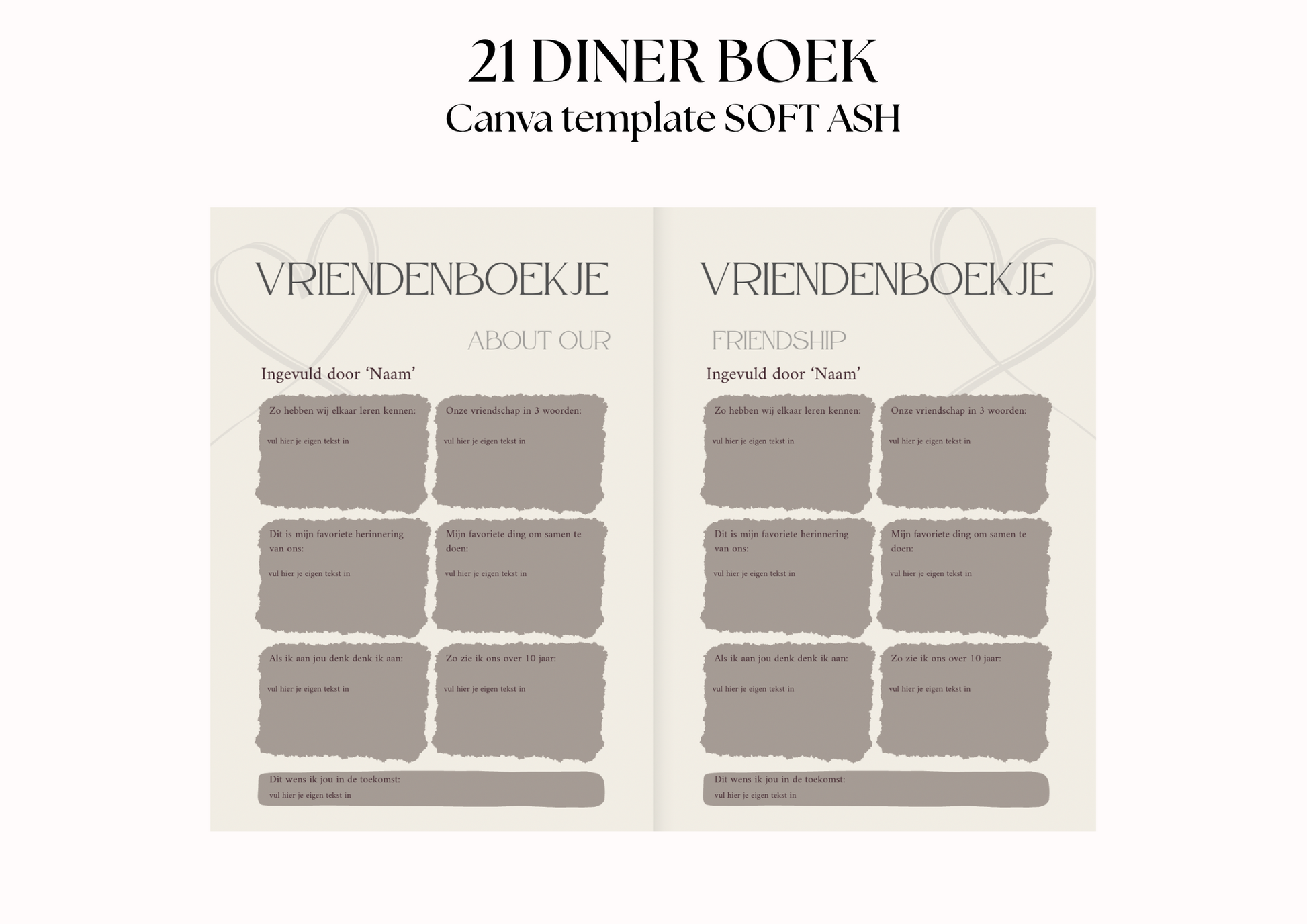 Template 'Soft Ash' is een 21 diner boek die je volledig kunt aanpassen in Canva. Voeg je eigen persoonlijke teksten en foto's toe aan het template en geef je vriendin een prachtig boek vol herinneringen cadeau!