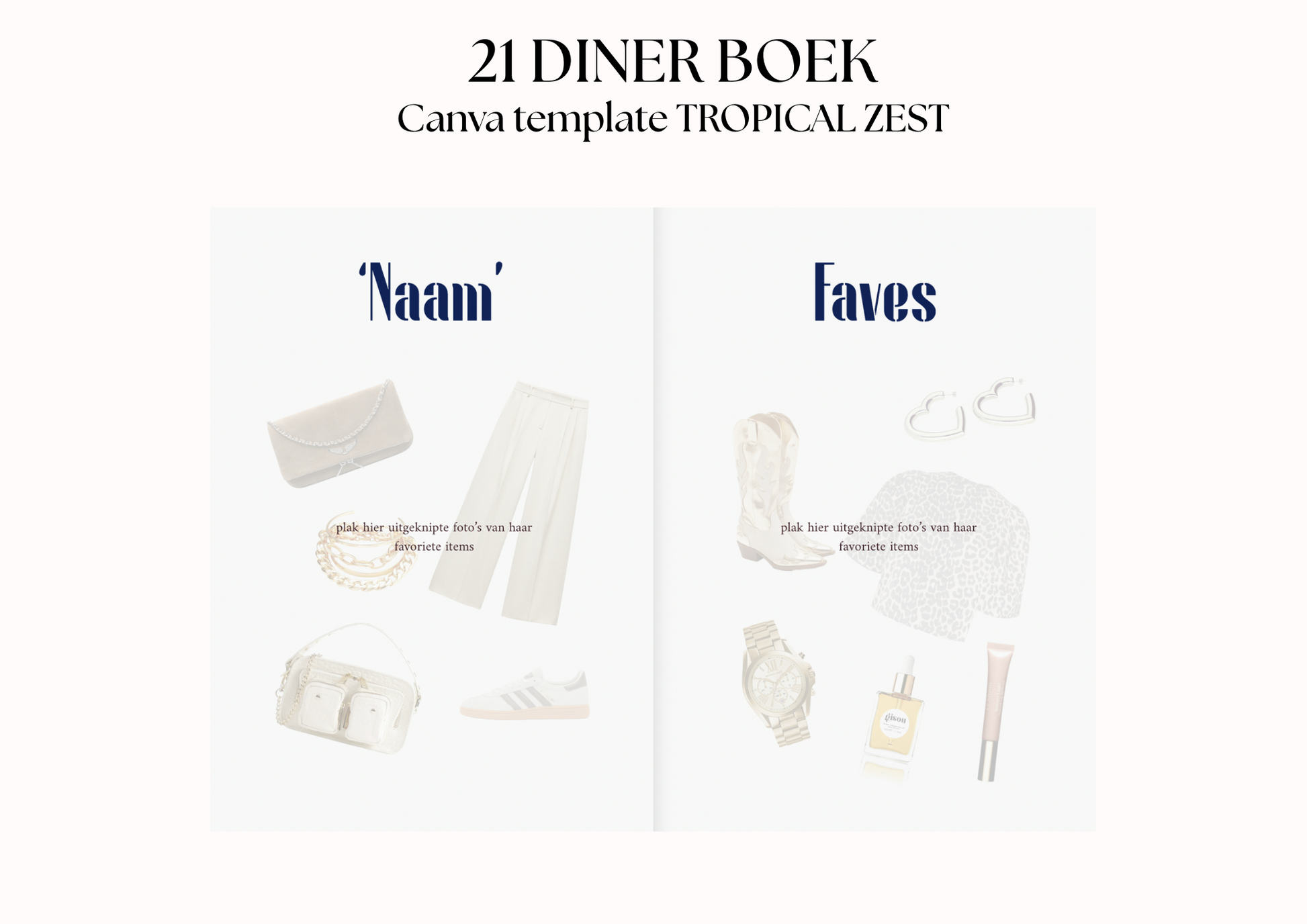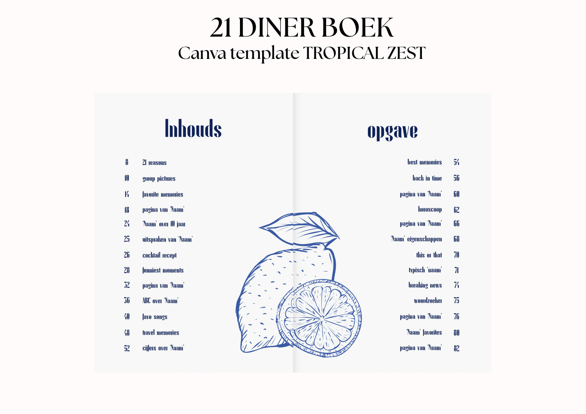Template 'Tropical Zest' is een 21 diner boek die je volledig kunt aanpassen in Canva. Voeg je eigen persoonlijke teksten en foto's toe aan het template en geef je vriendin een prachtig boek vol herinneringen cadeau!