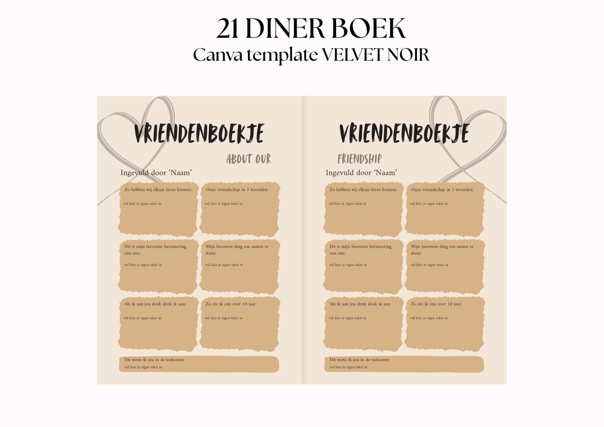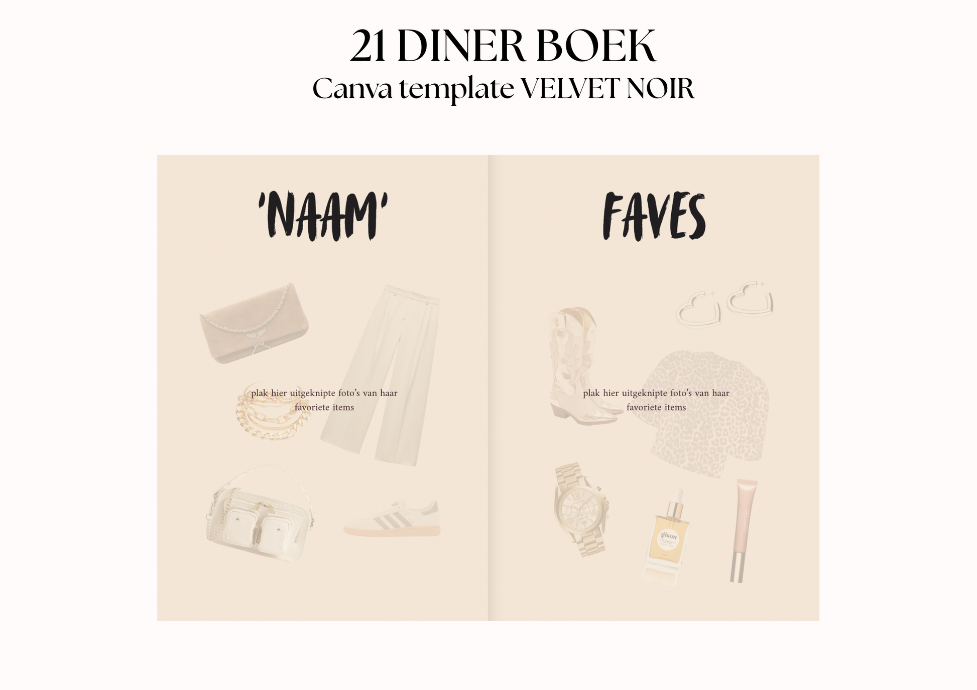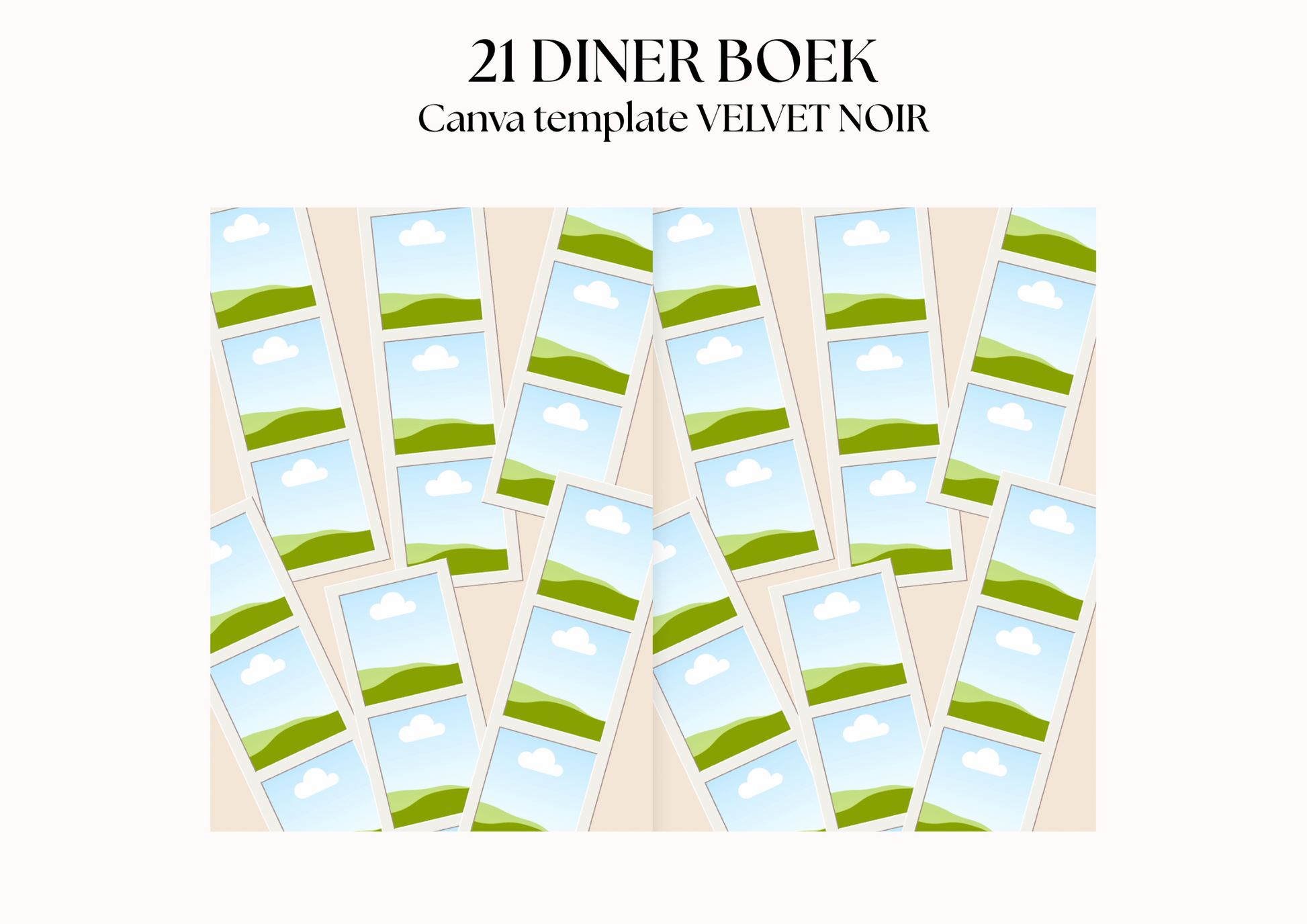 Template 'Velvet Noir' is een 21 diner boek die je volledig kunt aanpassen in Canva. Voeg je eigen persoonlijke teksten en foto's toe aan het template en geef je vriendin een prachtig boek vol herinneringen cadeau!